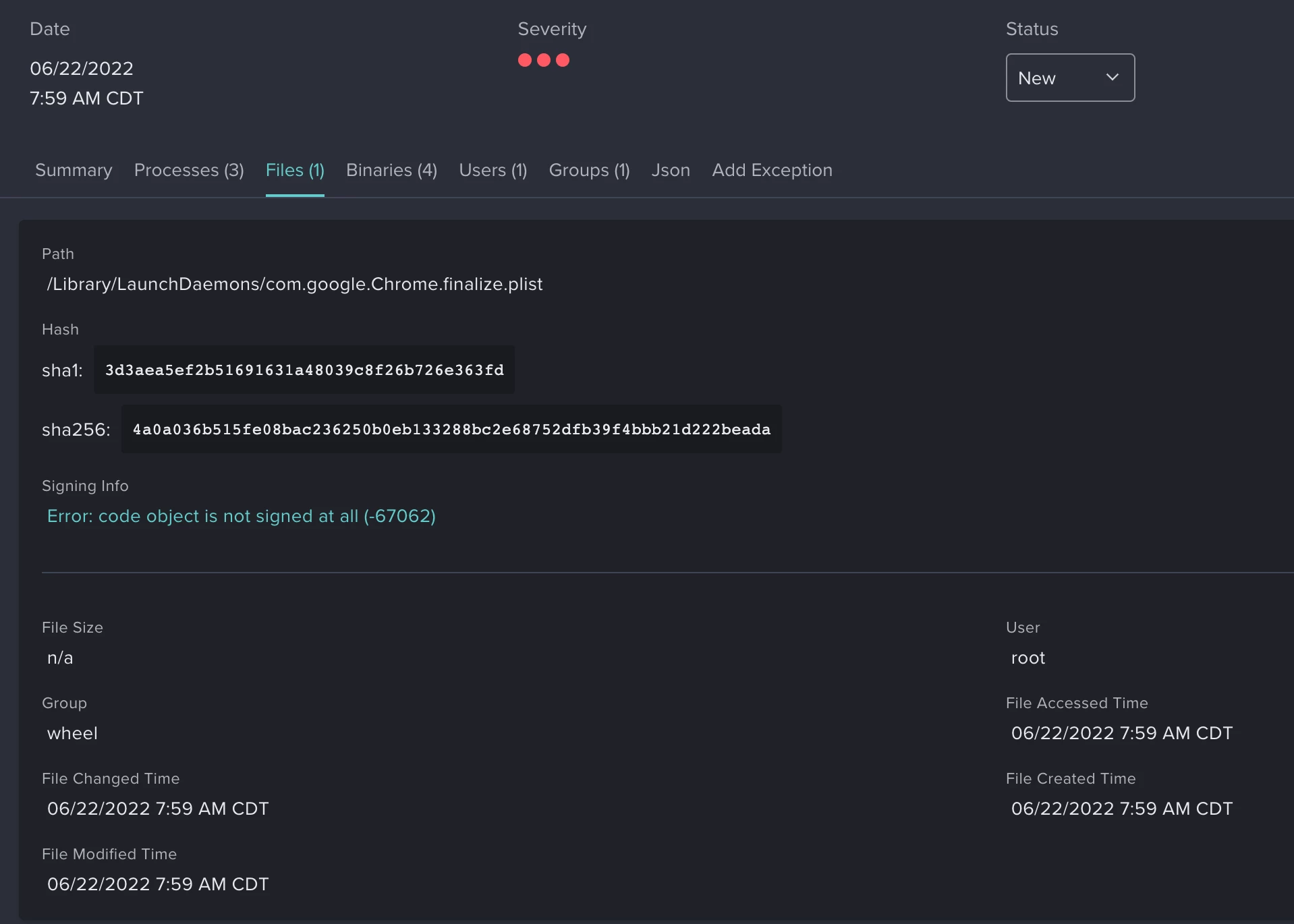 Unfortunately, due to the name of this new LaunchDaemon starting with com.google this has been flagged by Protect. If we dig a little bit more on the JSON file of the Alerts that Protect has been firing up, if we notice those