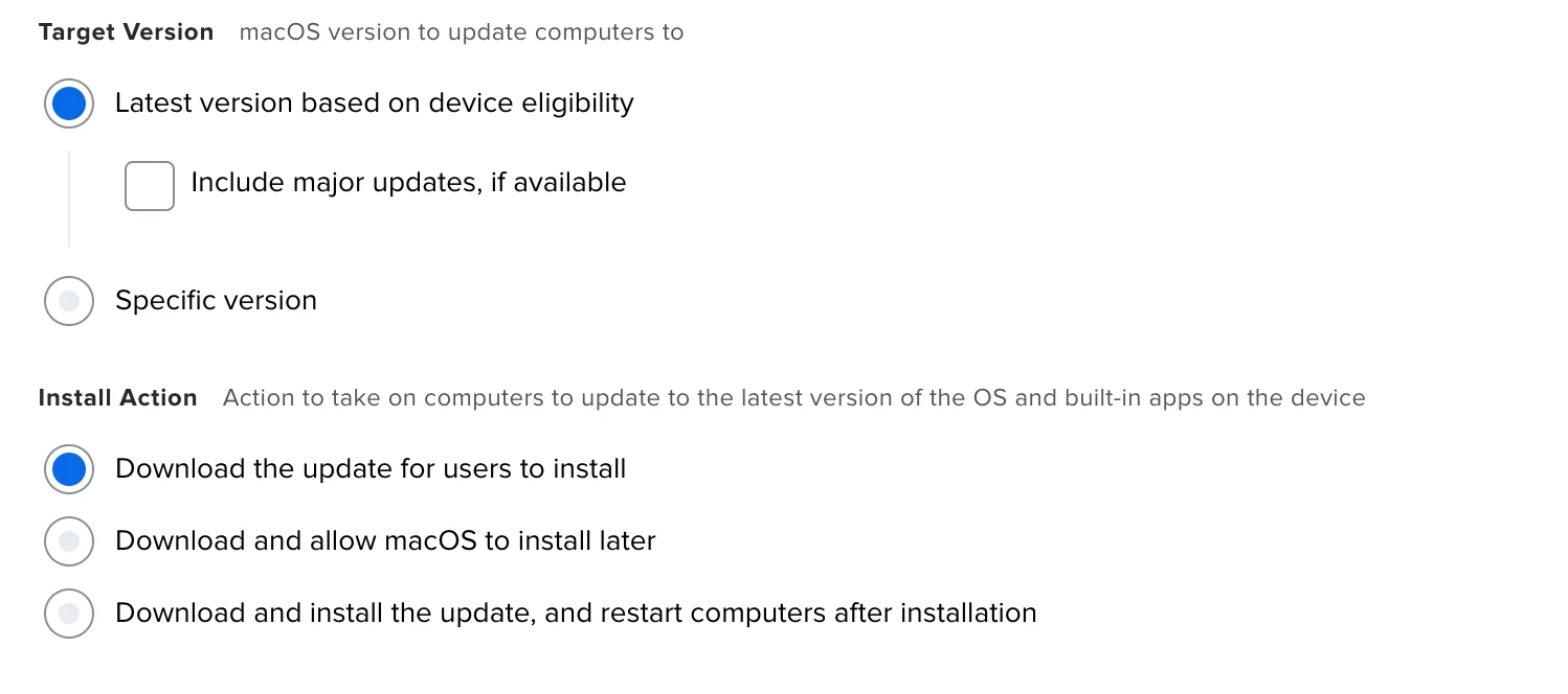 Search Inventory > New > Criteria > Computer Name ( select the computer you want to update or group of computers) > Search > Action > Send Remote Commands > Update OS version and built-in apps (macOS 10.11 or later, Supervised or enrolled via a PreStage enrollment)