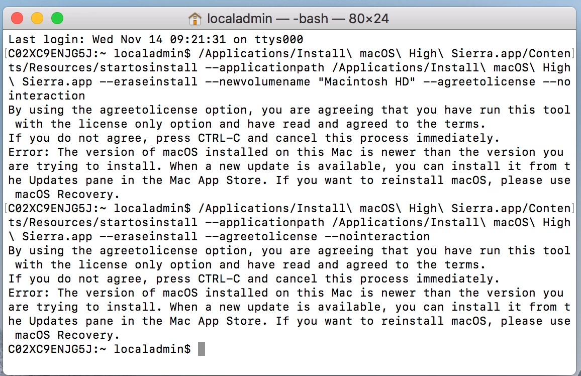 /Applications/Install macOS High Sierra.app/Contents/Resources/startosinstall --applicationpath /Applications/Install macOS High Sierra.app --eraseinstall --newvolumename "Macintosh HD" --agreetolicense --nointeraction