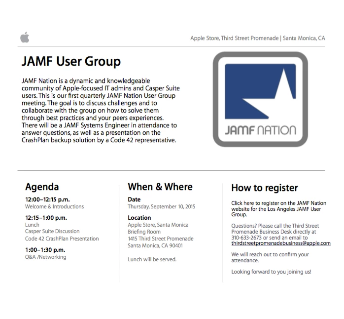 Writing to send a reminder that tomorrow 9/10 is our JAMF Nation User Group meeting with our SoCal JAMF Rep & Engineer, as well as a Code 42 Engineer.