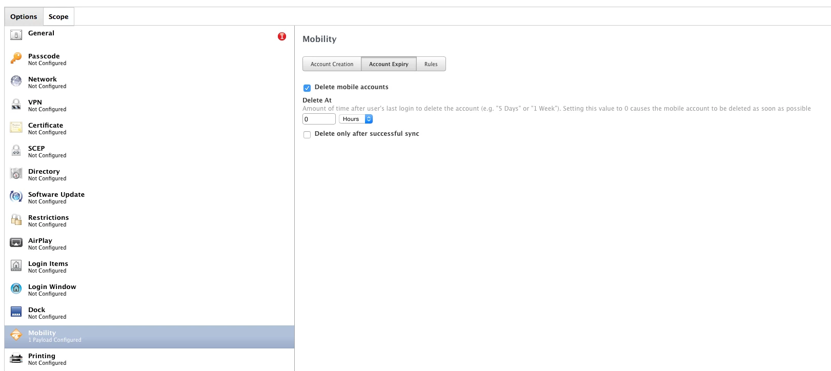 This functionality appears to not be working, at least setting it to 0 which is supposed to delete the account at logout. Neither the mobile account nor home folder are deleted as they should be. In the old days of the OS, say 10.6 with WGM/MCX, this worked properly, but so far it seems to be broken in 10.10.4 using a profile. I have not tried to lengthen the expiration time yet to see if it's only 0 value that is bugged.
