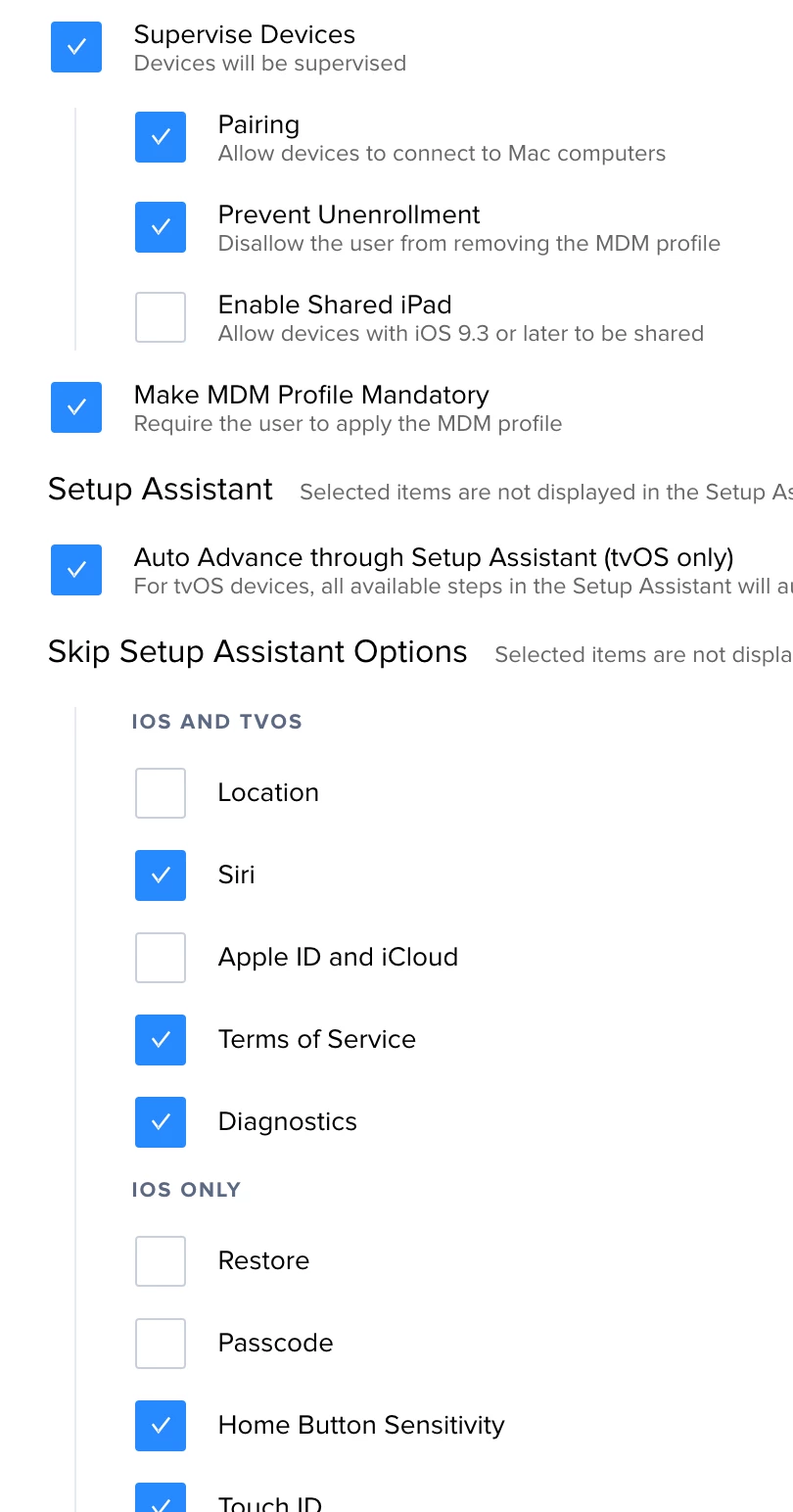 For our purpose I have the initial set up skip restore as we don't want to allow users to restore from home devices but we do want to be able to restore from internally configured devices, on request, the device is assigned to a clone of the Pre-Stage with the above options unchecked.