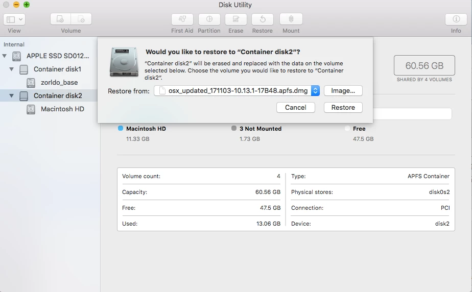 I am trying to image a system with macOS High Sierra from a AutoDMG'ed file. I created the DMG while on my macOS HS (10.13.1). But while in Disk Utility, in Target Disk Mode to the system to be imaged the restore button is greyed out. The destination Volume was formatted to APFS. What would be the best alternative?