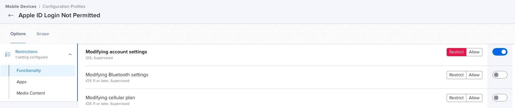 We need to deny users the ability to login to their iCloud account on iPhones and iPads. I created a configuration profile for this that grays out the area where a user would tap to log into their Apple ID. Unfortunately it also keeps them from going into Settings - Mail and adding an email account like Microsoft 365, Google, etc. It also keeps them from adding an account to Outlook on their iPhone or iPad. This is something I didn't expect. Does anyone know how to keep users from logging into their Apple ID but allow them to login to their email account and set it up in either the built-in apps or Outlook? I've attached a screenshot of the payload used in my profile. This is the only setting I have found that prevents users from logging into iCloud.