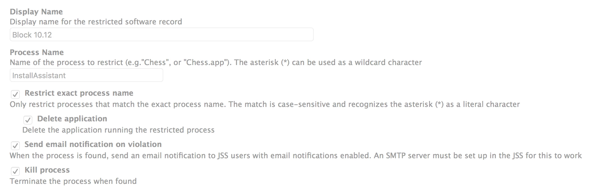 I wanted to restrict Mac users from upgrading to Mac OS v.10.12 Sierra by implementing a Restrict Software Policy and a Configuration Profile Scoped to All Systems. Is it possible for an end user to still be able to install the Mac OS v.10.12 onto their system if external from the corporate network. NOTE: Our JSS isn't external facing and since we on Office365 do users seldom use VPN to connect to corporate network unless Remote into Servers/Workstations. I just had a user upgrade their system to new Mac OS v.10.12. System hasn't checked-in or update jss inventory in a week. Any thoughts or suggestions? Need to understand where I have setup something wrong in Casper Suite.