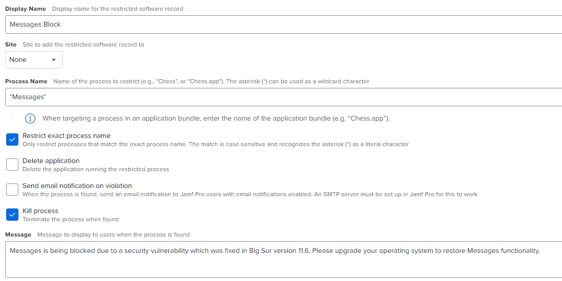 Due to Pegasus, I am trying to restrict "Messages.app" from running, but even though I am getting a pop-up notification telling me that it is being blocked, the app still launches.