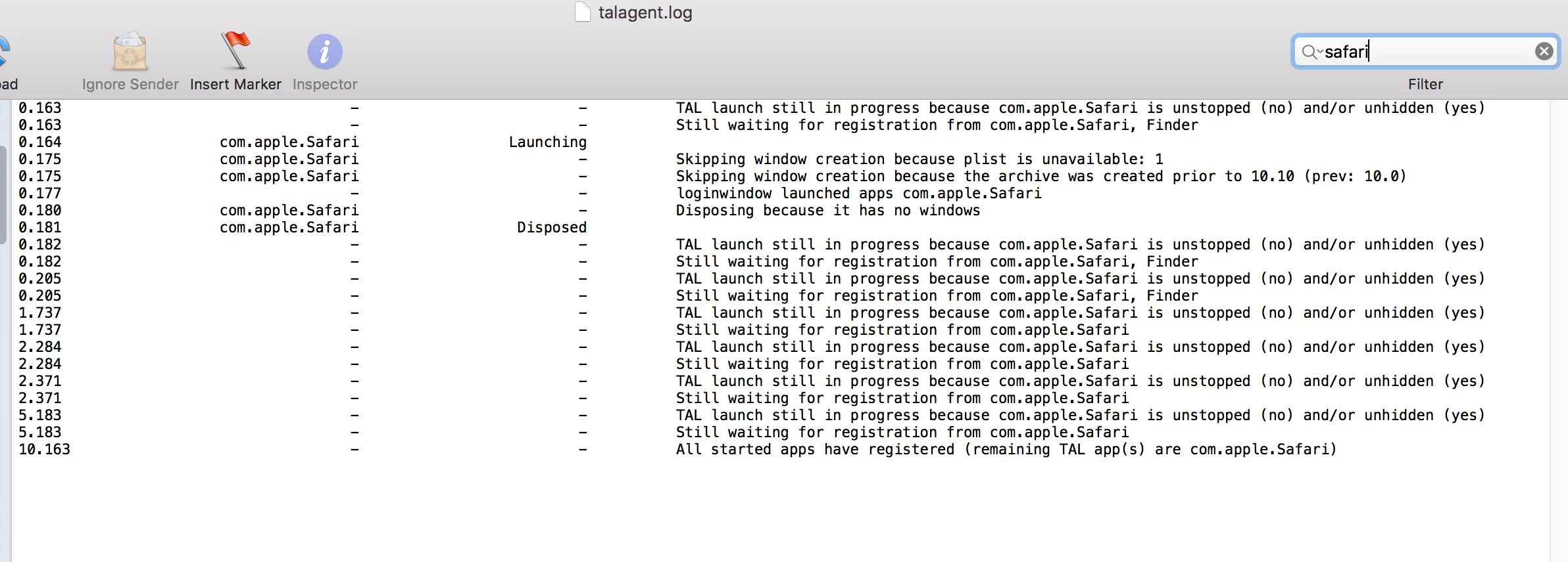 So something in my configuration is causing each new user, as they log in, to see Safari open in the dock (no window, just the dot below the icon), and frozen. Everything else looks and acts normal, and if they force quit Safari and then reopen it, it's fine and it doesn't happen again. The fact that it happens to all new users tells me that something in my config is probably editing the User Template with a bad Saved Application State or something, but I can't find anything in any of my DMGs that would do that (I've been moving away from DMGs and editing the User Template and toward PKGs and Config Profiles but I'm not all the way there yet.) I found these entries in the talagent.log (attached pic) and was wondering if anyone could give me an idea of what is going on