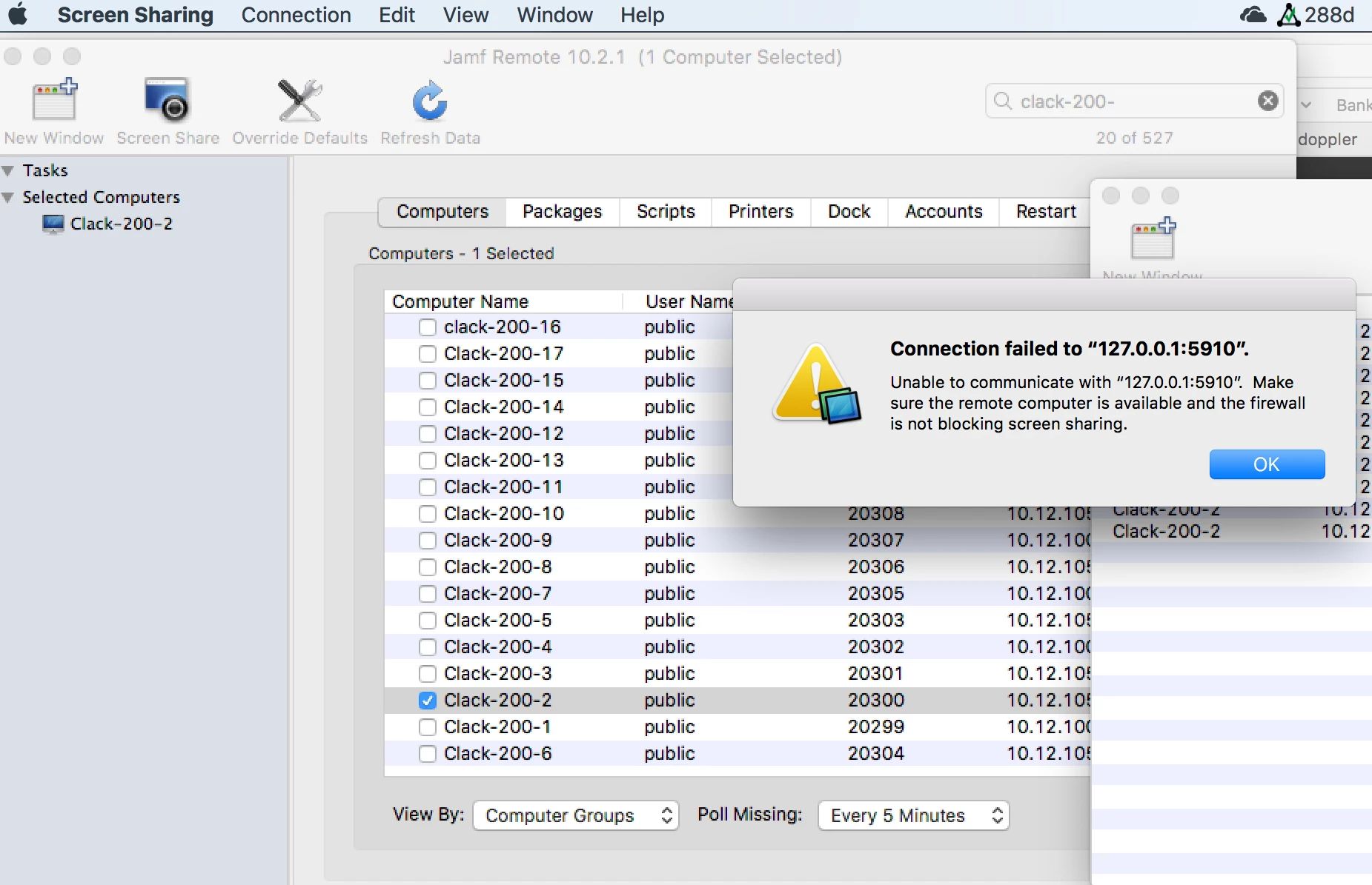 I have the same problem trying to do screen sharing with JAMF Remote that I have always had with Apple Remote Desktop (ARD). About half the time I will get connection errors on attempts to connect to the client. See attached image.