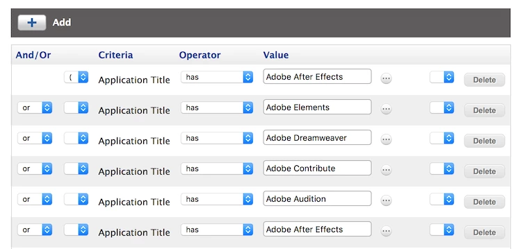 You'll can do what @McAwesome said. If you just put in something like "adobe", then you'll hate life. Find the names of the apps and put them into the search criteria.