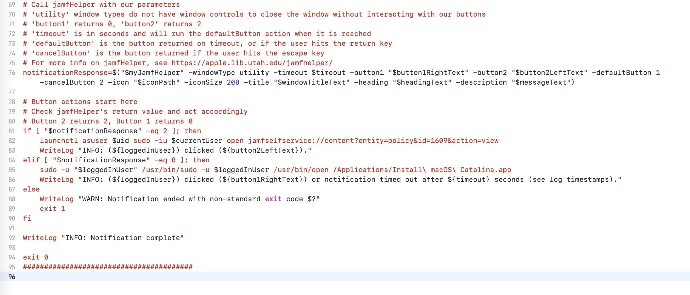 notificationResponse=$("$myJamfHelper" -windowType utility -timeout $timeout -button1 "$button1RightText" -button2 "$button2LeftText" -defaultButton 1 -cancelButton 2 -icon "$iconPath" -iconSize 200 -title "$windowTitleText" -heading "$headingText" -description "$messageText")