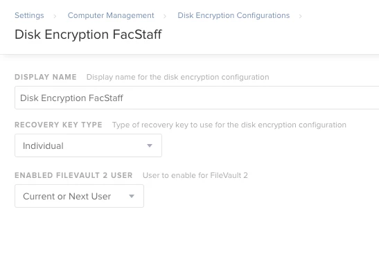First, you'll need to to go to Settings -> Computer Management -> Disk Encryption Configurations and create a configuration.