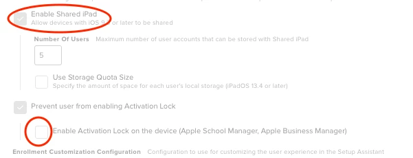 When I try to turn on "Enable Activation Lock on the device (Apple School Manager, Apple Business Manager)" in PreStage Enrollments, and the Shared iPad option is also selected, when I click Save it always ends up clearing that Activation Lock option.