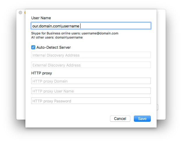 Trying to get Skype for Business deployed to some macs. It will install with no issues however when signing in, it will not auto detect servers. Microsoft help is lacking. Anyone have any experience with deploying Skype for business via JAMFand having it auto detect servers?