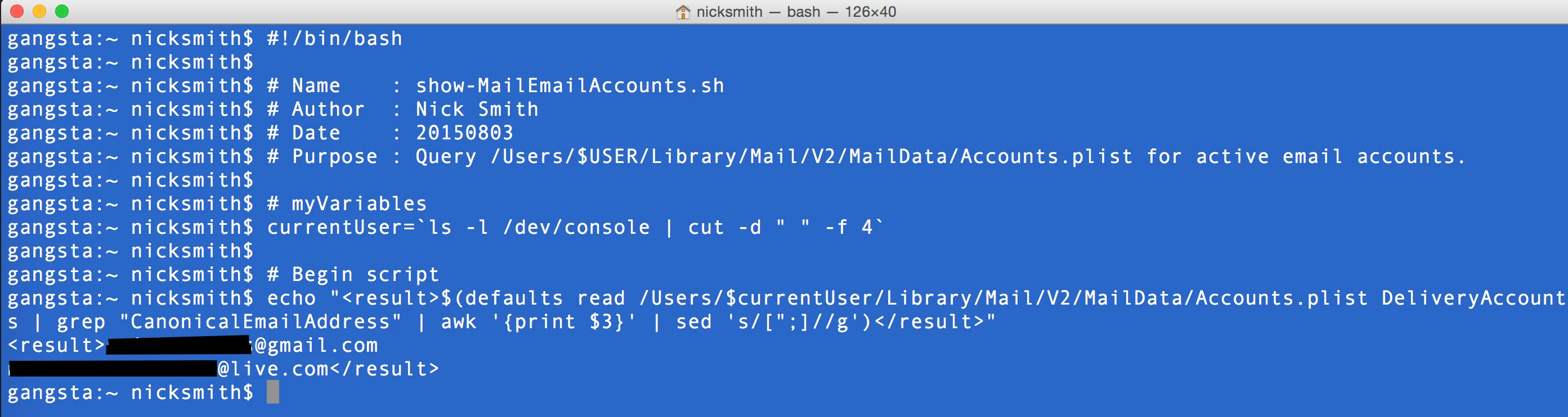 # Purpose : Query /Users//Library/Mail/V2/MailData/Accounts.plist for active email accounts.