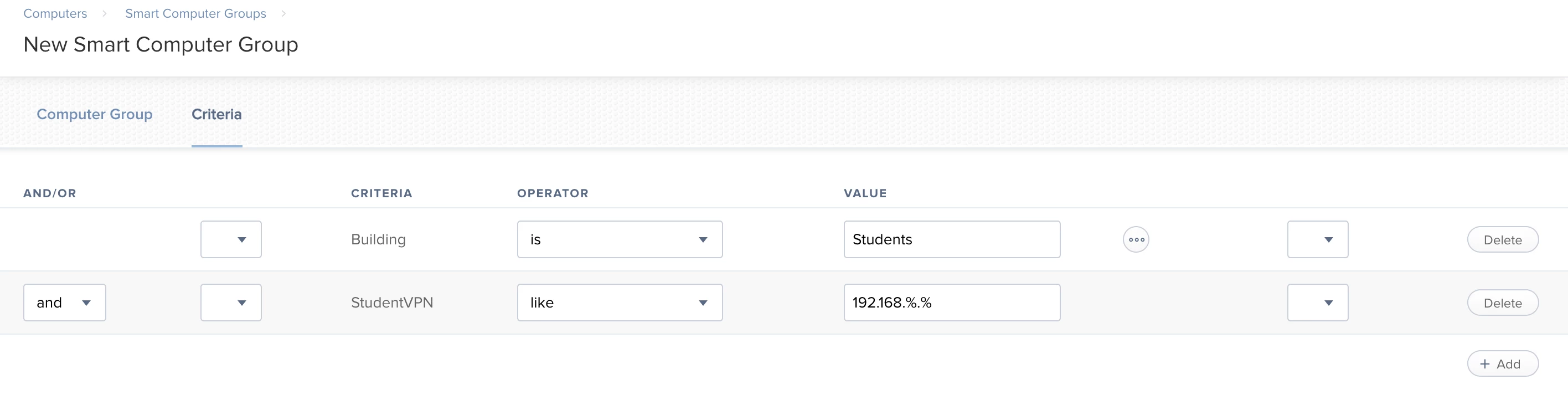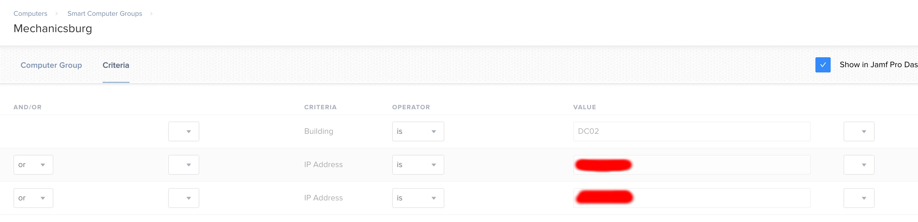 Basically, I have six sites (more, but let's just focus on the main six). They include our SF HQ and five distro centers across the US. If I assign a laptop to the "Building" SF everything works as expected --- all computers appear in that Smart Group. If I assign a laptop to any other sites (DC01, DC02...) they never automatically appear in the associated Smart Groups. I've even more recently tried adding those locations IP addresses as criteria for membership... yet nothing. See image below, and any help at all is appreciated.
