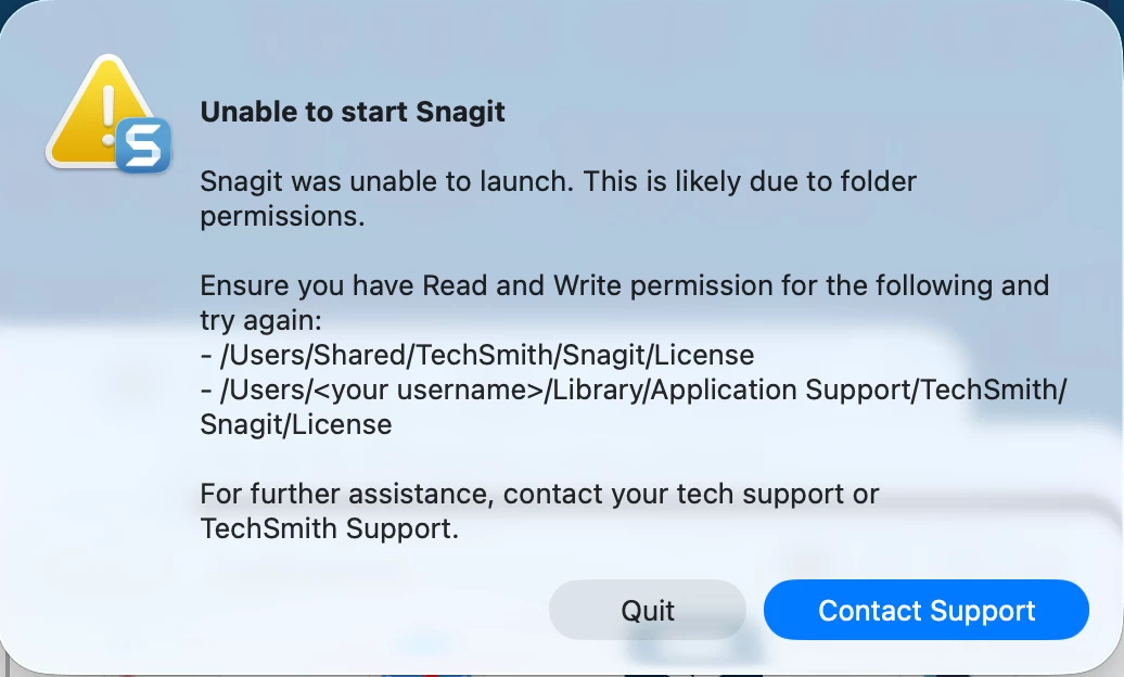 The issue happens the first time you attempt to open Snagit. On app execution, you are presented with the error below: