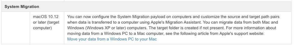 "You can now configure the System Migration payload on computers and customize the source and target path pairs when data is transferred to a computer using Apple's Migration Assistant. You can migrate data from both Mac and Windows (Windows XP or later) computers. The target folder is created if not present. For more information about moving data from a Windows PC to a Mac computer, see the following article from Apple's support website: