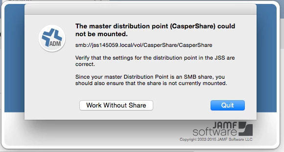 I am trying to set up a test JSS for trials. I believe I have the server set up and working, but I can't make a connection to the caspershare from Casper Admin. I tried to duplicate my production caspershare on my test server by using Casper Admin to replicate the data to a drive on the test server. I keep getting this dialog: