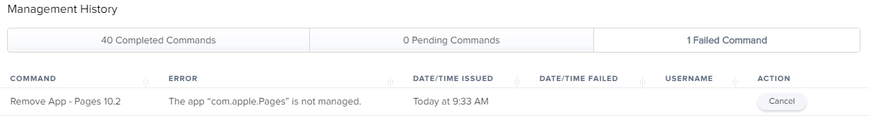 In my student restrictions Configuration profile, I have the "Some Apps Not Allowed" configured to not allow installation of the Pages app....all of a sudden I am getting failures on the Remove command that say this: