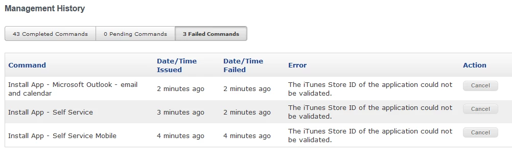 It prompts for iTunes credential, I hit cancel and it installs OneNote and nothing else. I then get the following errors for Self Service and Outlook: