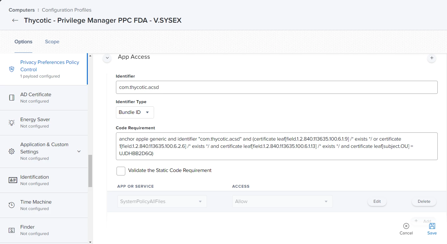 Has anyone been able to successfully grant Thycotic agent full disk access via Configuration Profile deployment? I am experiencing issues being able to deploy a configuration profile that successfully does this.