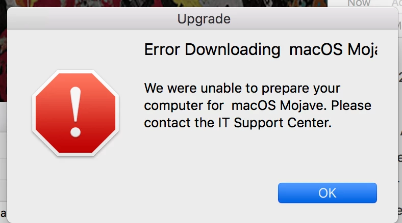 When trying to upgrade from 10.13 to 10.14 keep getting "We were unable to prepare your computer for macOS Mojave. Please contact the IT Support Center."