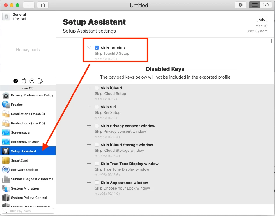 @Mauler for custom profiles, it's expected behavior to not see any payload info in the Jamf interface. If you push the profile you made to a test machine, and then sign in as a new account for the first time are you still seeing the Touch ID enrollment screen?