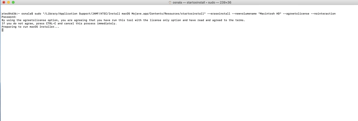 I've tried running the command but via policy calling the installer but it just sits there. I've tried running it manually in terminal and same result but shows "Preparing to run macOS Installer..."