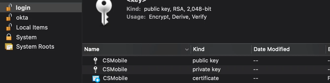 Verified that I can see the certificate as well as the public and private keys in the keychain