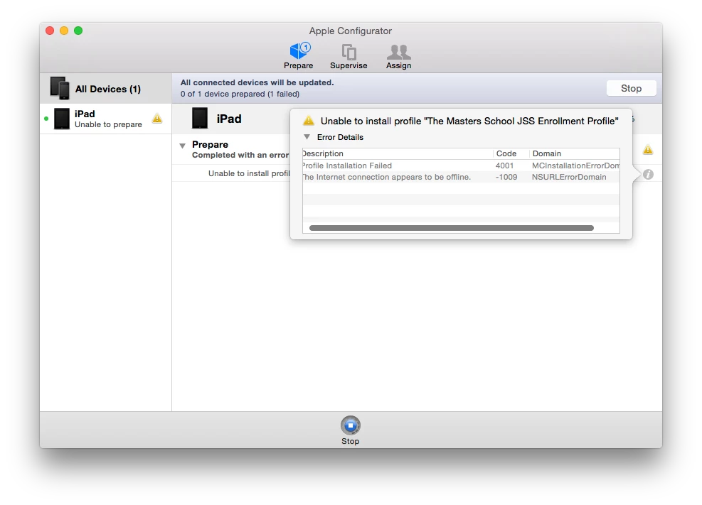 While the prepare process goes off initially without any issues, I run into problems toward the end when Configurator attempts to install the JSS Enrollment Profile. I get 2 errors when it attempts to install the enrollment profile. The Apple Configurator machine I'm using is on the same VLAN as our JSS and is able to get out to the Internet, so I'm confused as to why there's an error saying the connection appears to be offline ...