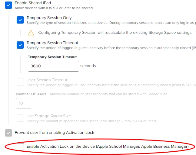 Why can't you turn on Activation Lock for Shared iPads? Even though you are given the option to enable it, as soon as you save the PreStage, the option is unselected. This appears to only be a problem when also selecting "Enable Shared iPad".
