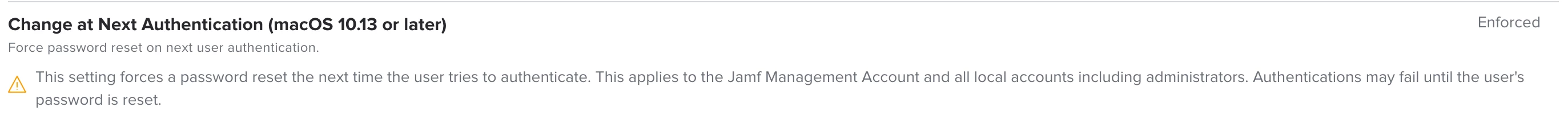 - We are thinking to use the "Change at Next Authentication" option in the JAMF Configuration profiles for password requirements (see below)