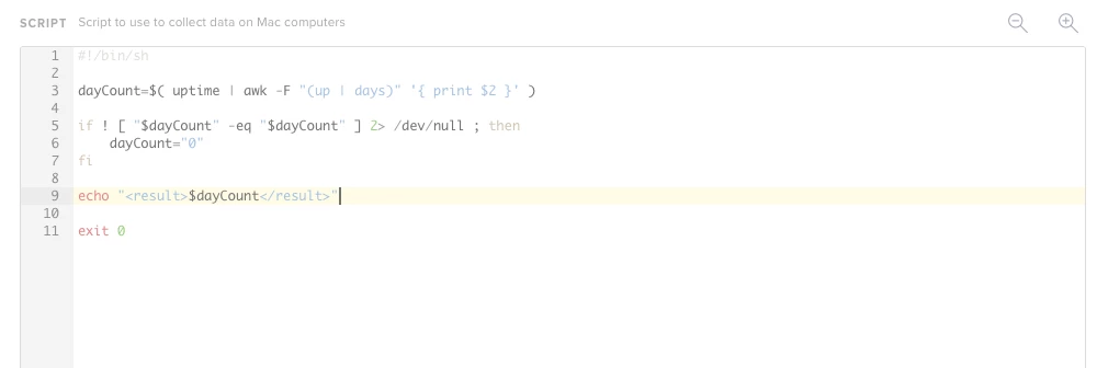 echo "<result>$(expr $(expr $(date +"%s") - $(sysctl kern.boottime | awk -F'[= |,]' '{print $6}')) / 60 / 60 / 24)</result>"