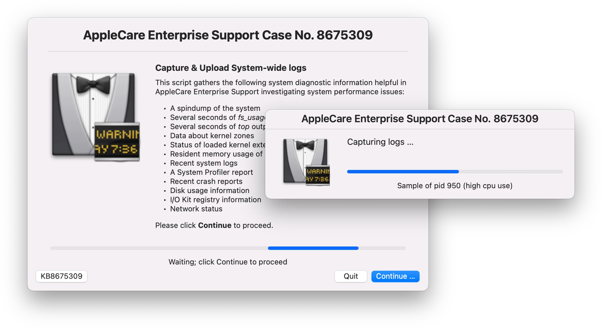 After attending @bradtchapman’s double-live JNUC 2022 presentation — not only was Brad live, so was his demo — I felt inspired to take a fresh swiftDialog-look at our Jamf Pro Self Service policy which allows users to generate sysdiagnose for use by AppleCare Enterprise Support.