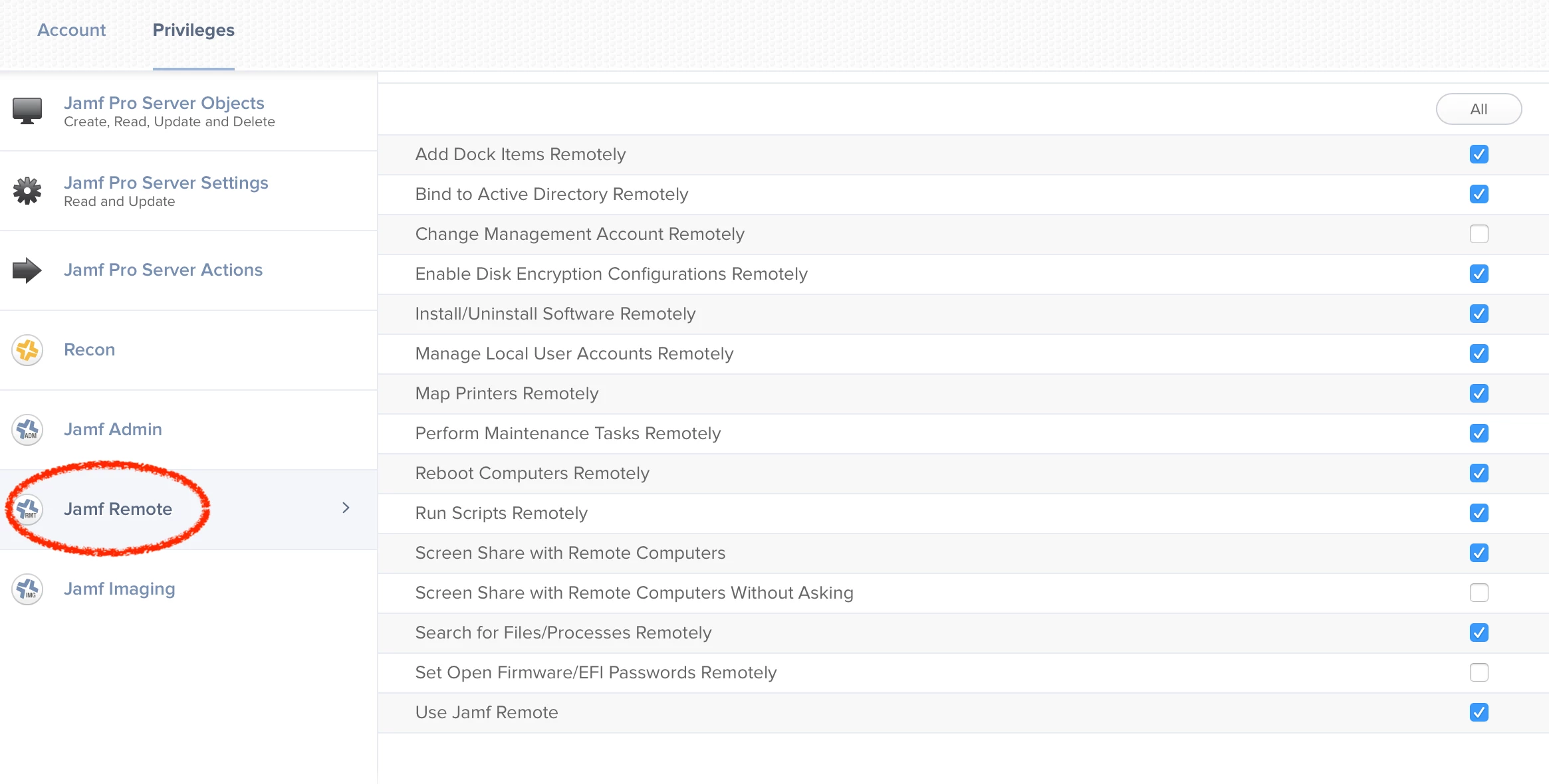 Anyone have a list of which permissions are required for a user in "User Accounts & Groups" to enable use of Jamf Remote?