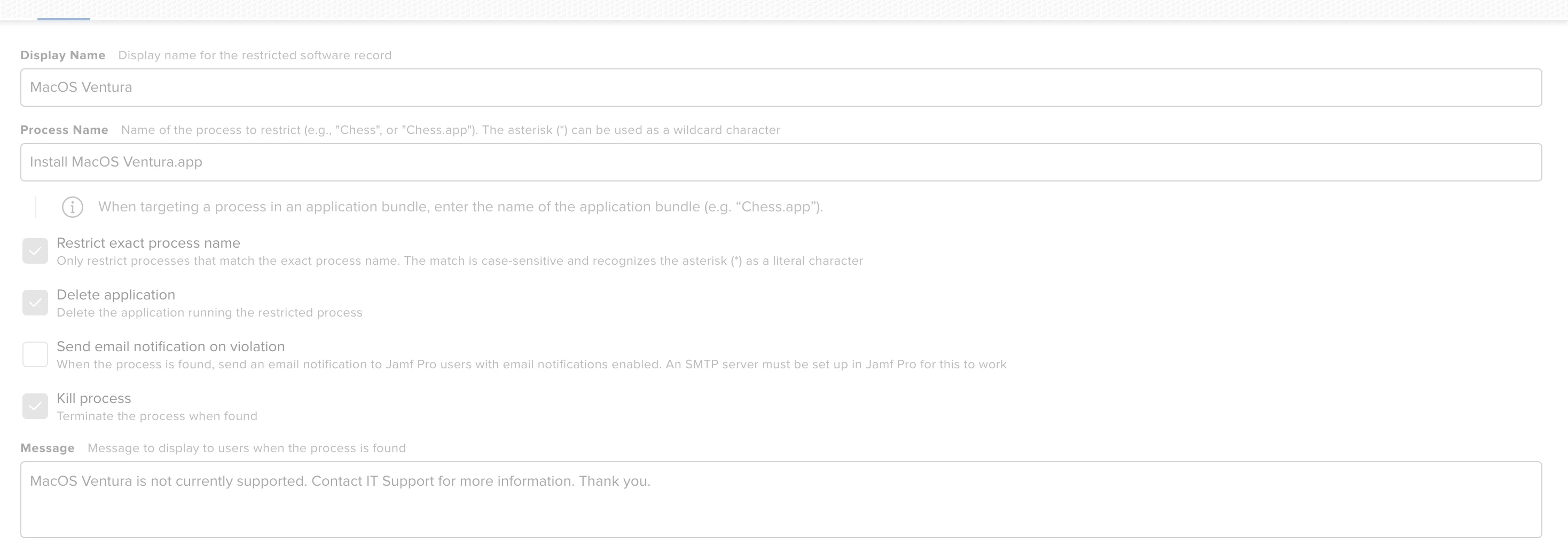 Might not be an issue but I noticed you have the process name as Install MacOS Ventura.app. I had a hiccup before with that and having Restrict exact process name checked as that makes it case sensitive. For my restriction, I put the process name as Install macOS Ventura.app.