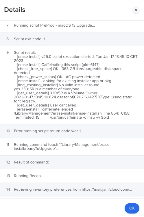 Did the user see the popup prompt for them to enter their password? It looks like in the script it says user cancelled so I'm guessing the prompt was exited or the password was not supplied. Make sure you're using the --current-user flag so they don't have to enter their account name - described here: https://github.com/grahampugh/erase-install/wiki/Legacy-6.-Upgrading-or-reinstalling-macOS