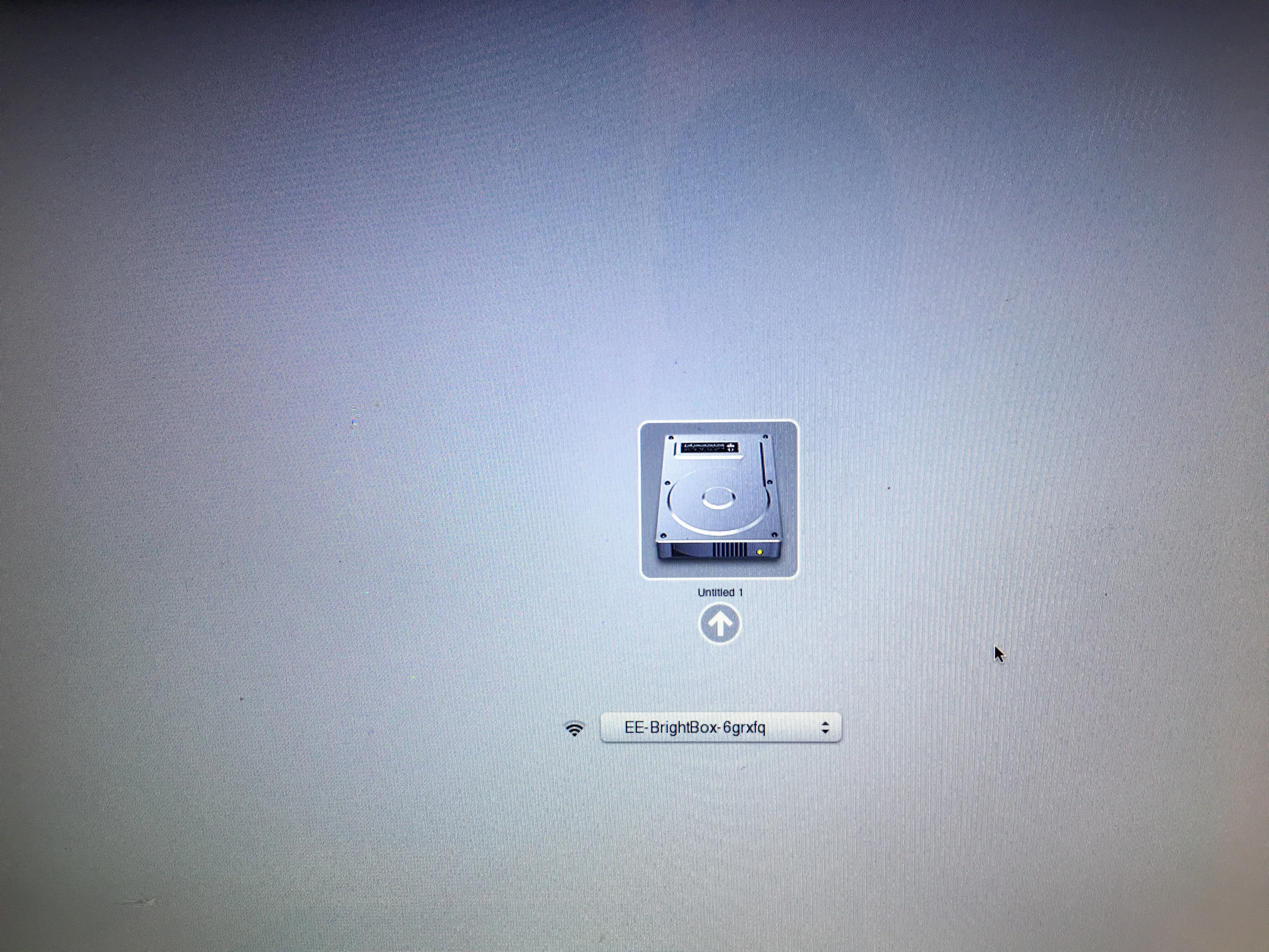 Holding option got me to a menu where I could see my hard drive but there isn't a recovery partition and if I double click the drive or click the arrow, white screen (actually grey screen).