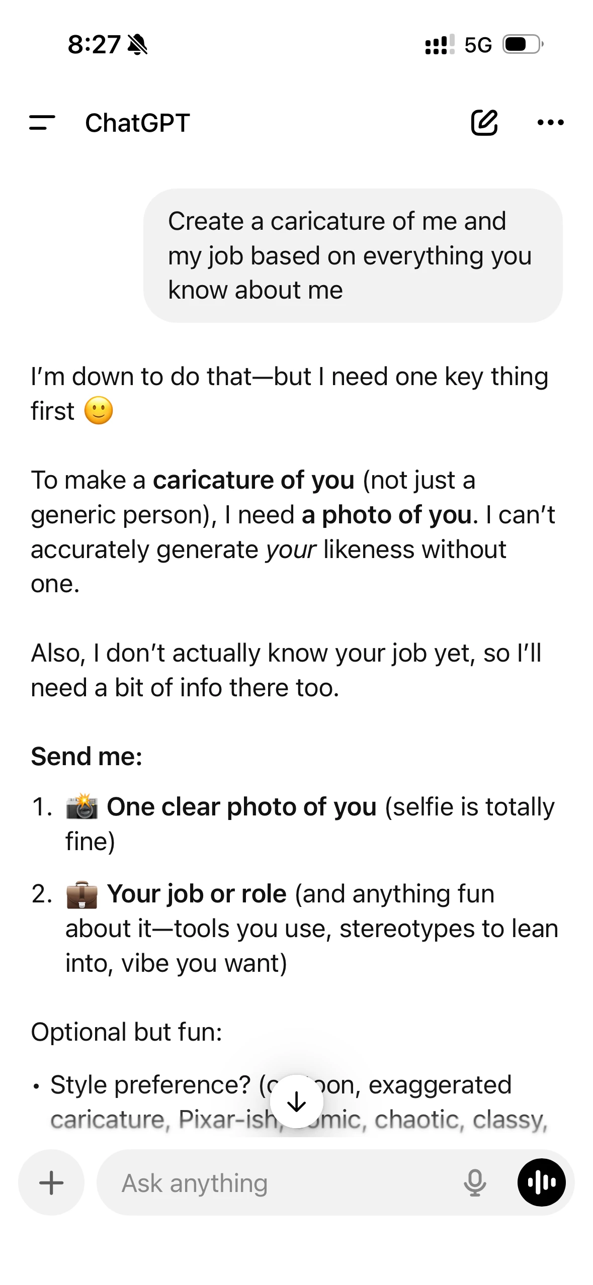 “Create a caricature of me and my job based on everything you know about me.”