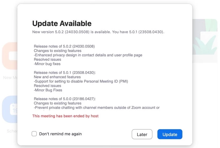 Updates within the IT version of the Zoom app are suppose to be disabled by default. Verify the version of Zoom the user is actually running is really the correct one. It may be installed within the user's home folder.
