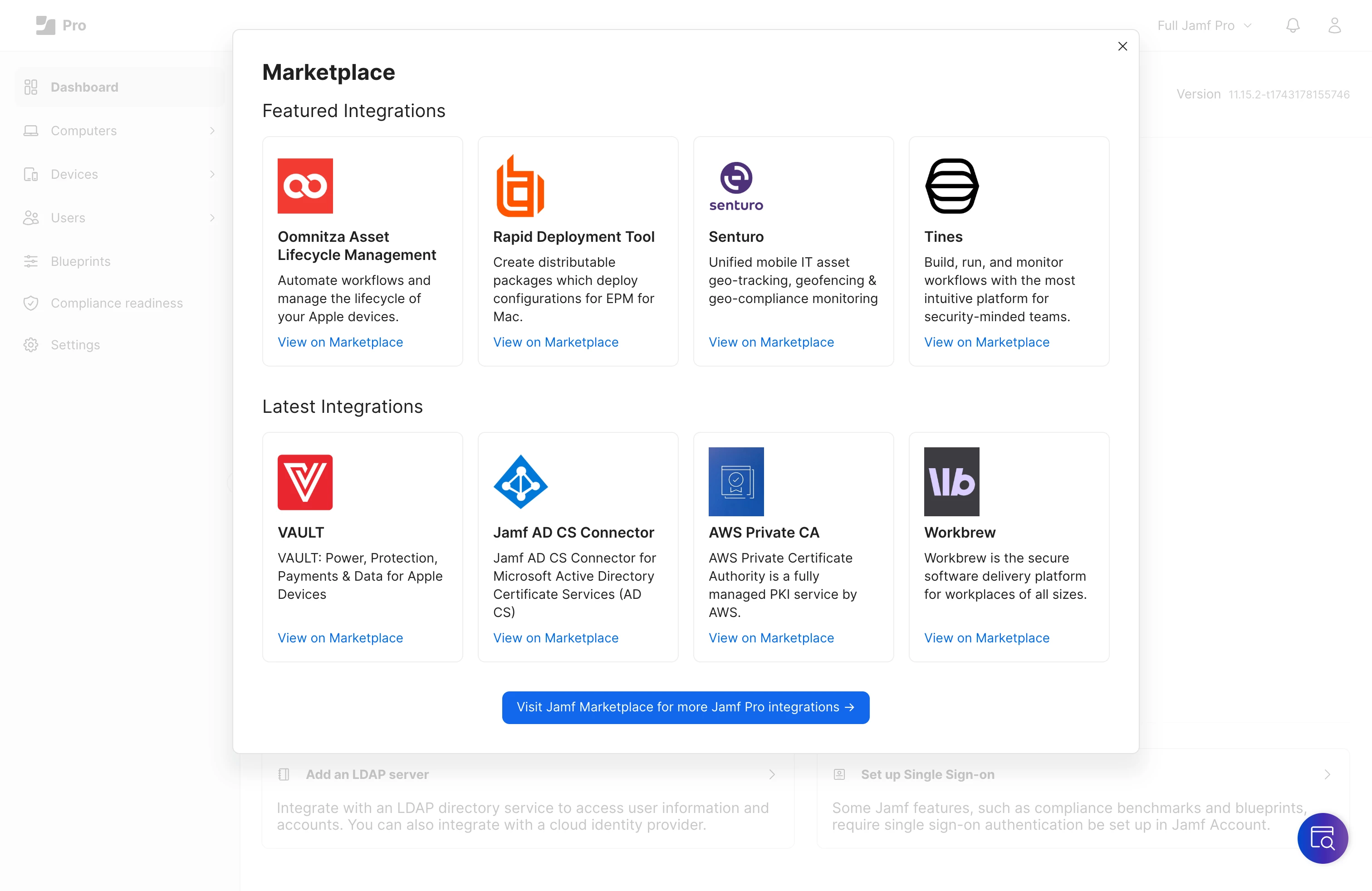 We’ve created a preview of some of the featured and latest listings of the Jamf Marketplace into Jamf Pro. To see them, click on “Jamf Marketplace” from the Resource Center.
