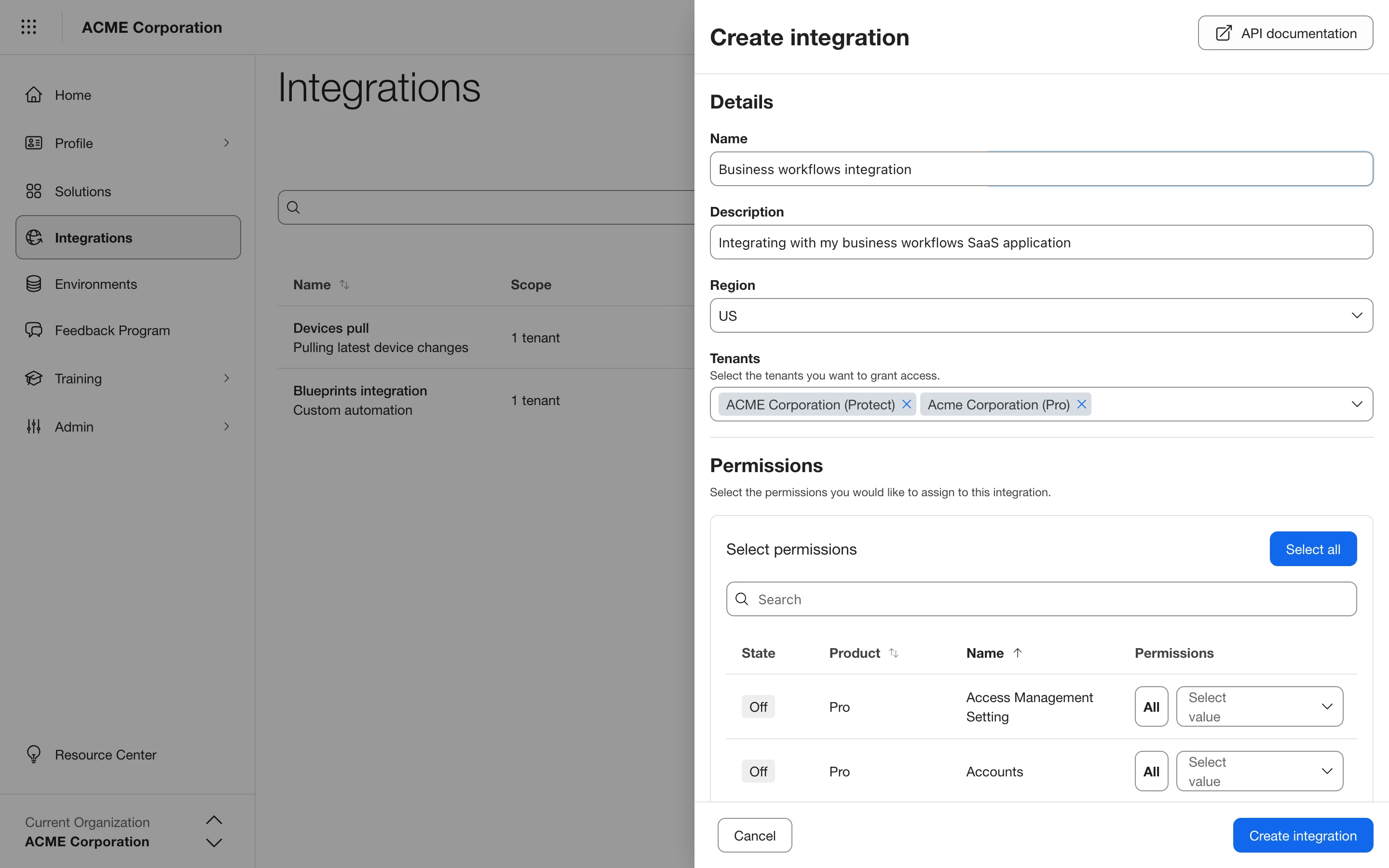 - If you don't have the Administrator role, create a custom role with Integrations privileges, assign it to your user, then log out and back in for the changes to take effect.