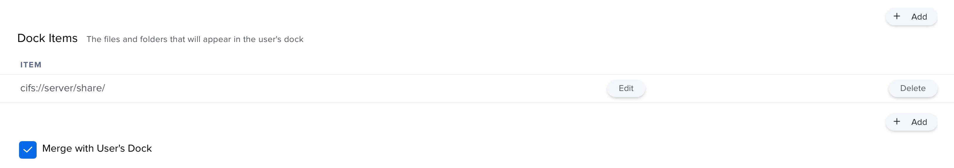 Under configuration profiles I tried to add a dock item pointing to an SMB share (smb://servername/sharename) but I just get a big question mark in the dock. What is the best way to add a network share to the dock?