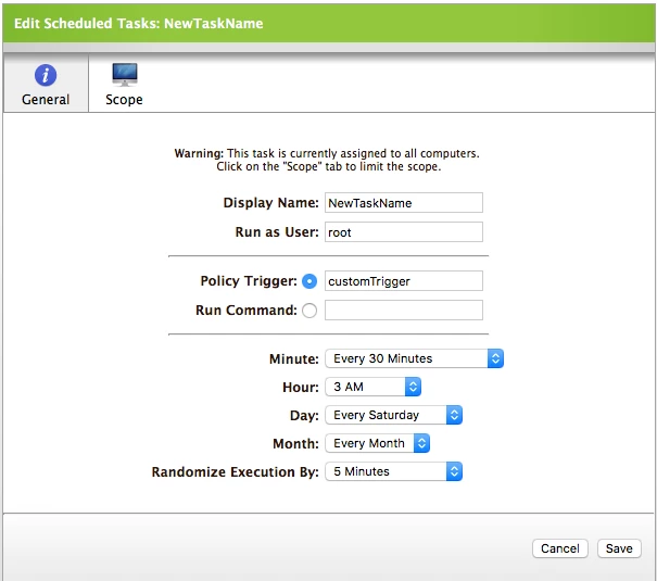 /usr/local/jamf/bin/jamf scheduledTask -command "/usr/sbin/jamf policy -trigger customTrigger -randomDelaySeconds 300" -name NewTaskName -user root -runAtLoad -minute '*/90/'