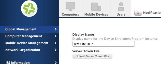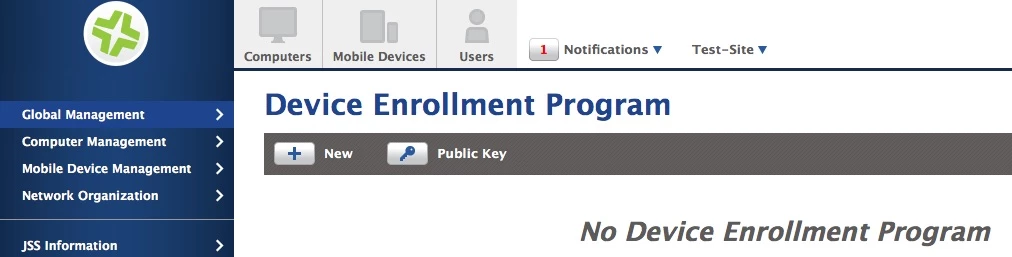 • Log into Casper, select your site (Test-Site) from the drop down, then download the Public key from "Global Management->Device Enrollment Program".