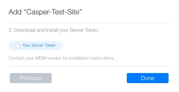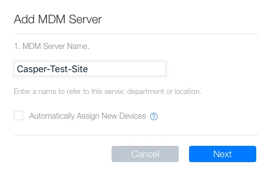 • Login to the DEP portal and click “Add MDM server”. Name it based on the site you are creating, in this case I will call it Casper-Test-Site. Do not choose “Automatically assign new devices” when setting up a new MDM server in the DEP portal if you plan to have multiple servers/sites.