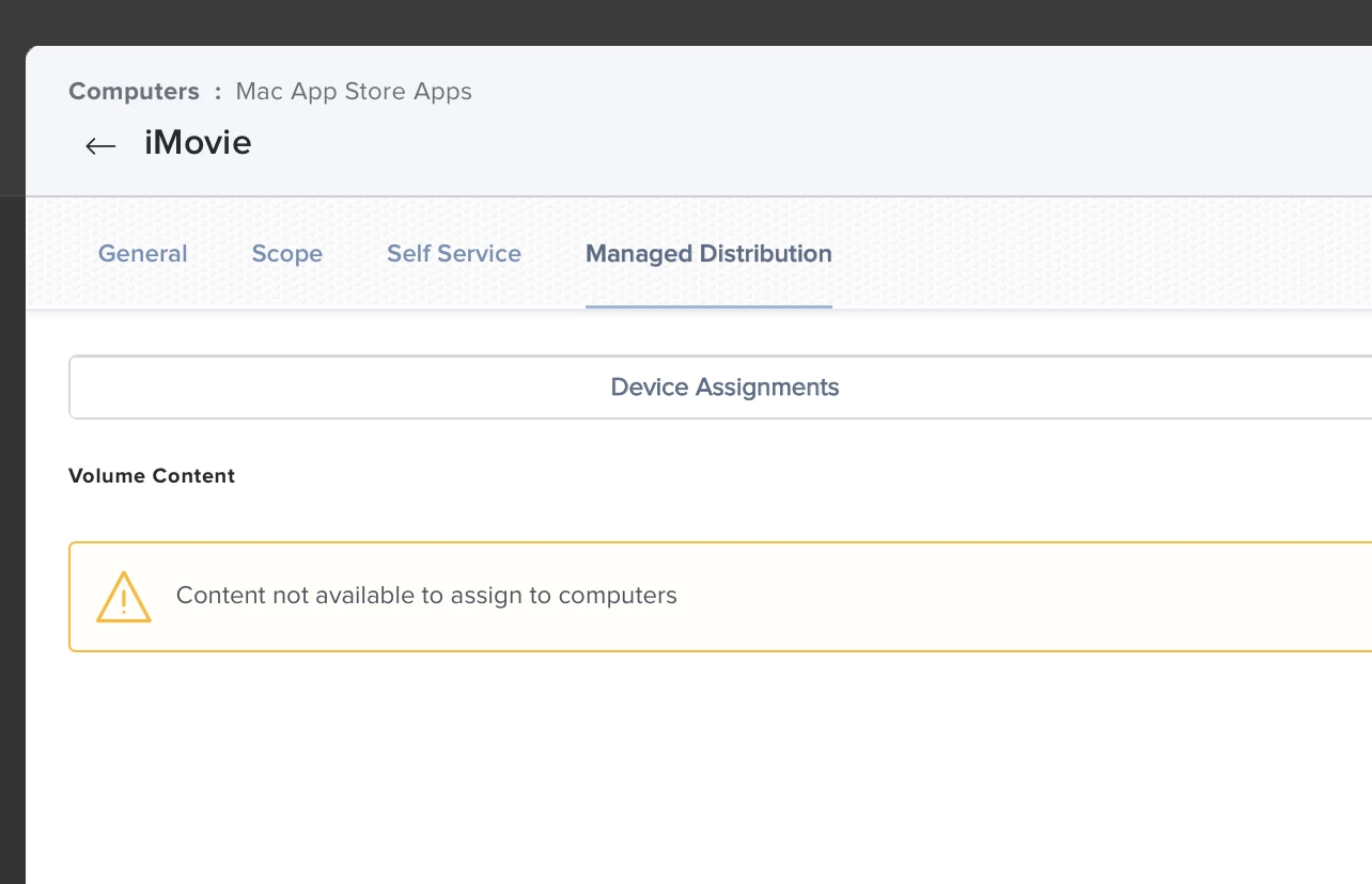 I am trying to make iMovie available to my staff users on their enrolled staff device via the self service app running macOS 10.15. I have added some licenses for iMovie from the Apps and books section of ASM and assigned them to Jamf Mac store apps. All is OK at first and staff can start the install of iMovie but when it finished they all get an error saying they haven't got access to the app store. We don't allow access to the App Store for staff via restrictions configuration profile, I don't understand why it is trying to access the App Store as it is available in the self service app. Has anyone come across this before and how did you get around it?