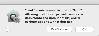 Somewhere around macOS 10.15.5 or so several of my users began receiving a pop-up message from Jamf requesting access to Mail. If you make a selection from the prompt it does create an entry in Security & Privacy under Automation. I worked with an engineer at Jamf on the issue and they were not able to replicate it in their test environment or determine the cause in our environment. It seems to be connected to inventory collection and I can replicate the issue consistently