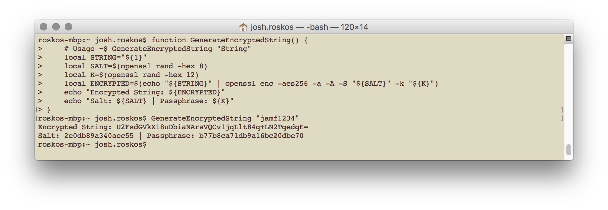 @jwojda I'm not sure if you ever got this figured out but I was hitting my head against a wall and then I found this post but ran into the .sh thing and yes, it still does not properly encrypt the password. I found another post that sort of pointed me in the right direction about actually modifying the .sh file and adding the GenerateEncryptedString "jamf1234" at the end of the script, and when ran it will just auto show the results...so I did this with the .py script instead but you have to follow the usage syntax in the python version...a little different the the .sh version, GenerateEncryptedString("jamf1234") and then you can run the python script from terminal using the "python filename.py" command.