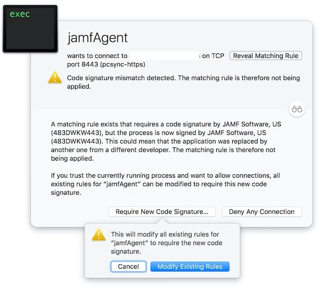 We recently upgraded our JSS from 9.97 to 9.101. Since then, our users keep getting notifications from Little Snitch about a code mismatch on jamf/jamfAgent processes. Pressing Require New Code Signature and Modify Existing Rules unfortunately does not silence this alert. I've seen it appear up to 15 times in a row after pressing Modify Existing....